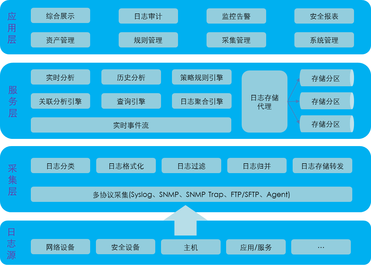 通过多种采集协议,从日志源采集获取日志,并对原始日志信息进行分类、规范化、过滤和归并等预处理,然后转发到服务层进行分析处理;